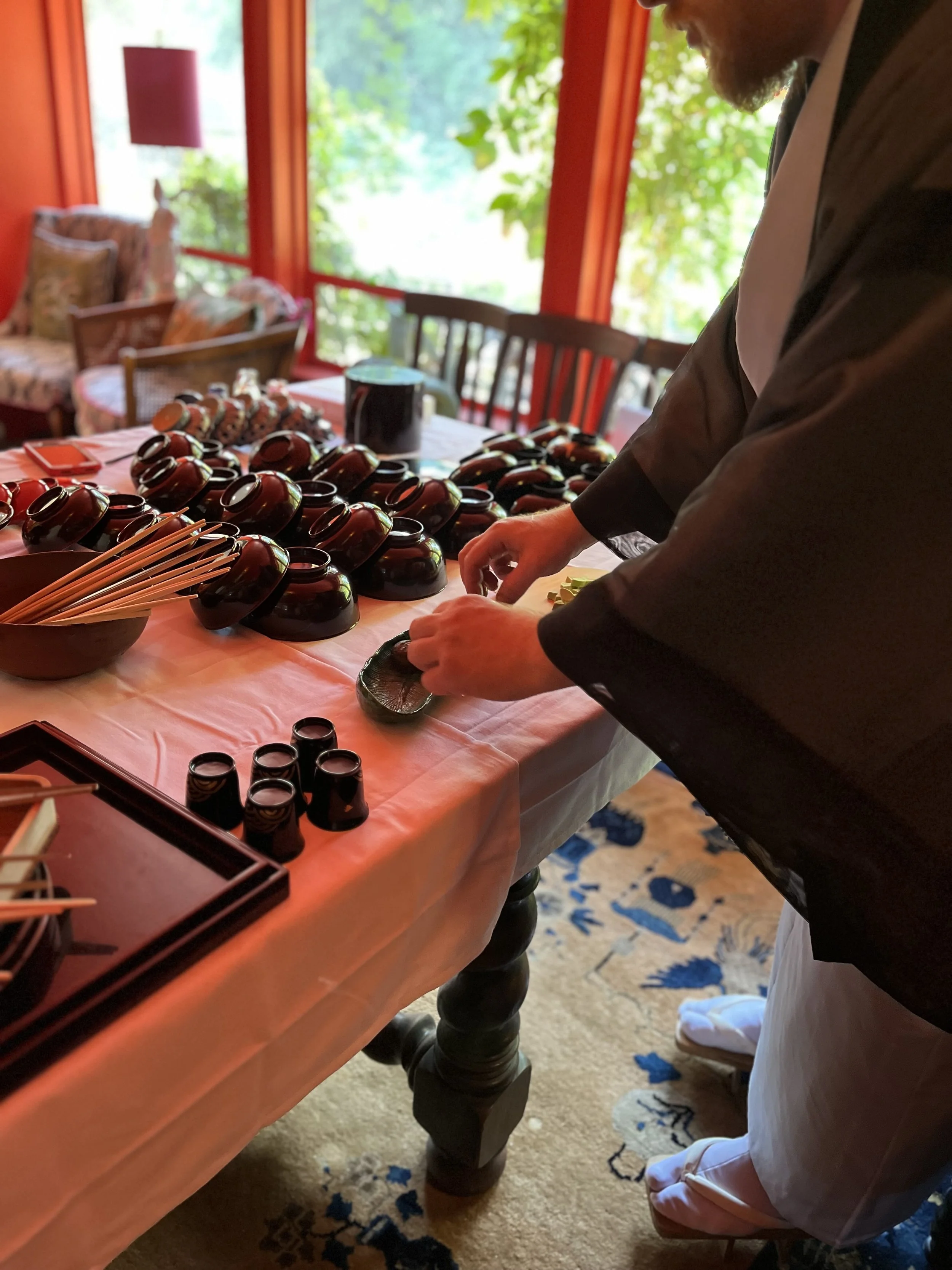 Our own President, Josh, produced a chaji on a Sunday in August. Some Birmingham Association members arrived at his house at dawn to catch the morning coolness of summer. This was also an occasion to embrace the virtue of the late 15th Grand Master Hounsai, and to thank him for his lifelong dedication for spreading his vision of peace through tea, and for connecting people beyond the boarder.